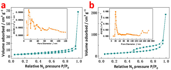 N2 isotherms and corresponding pore size distribution of (a) dense and (b) hollow CoSn(OH)6 nanocubes.