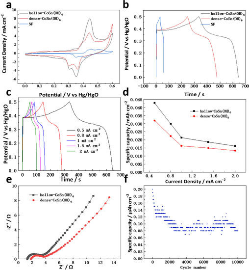 Cyclic voltammetry (CV) [28] and the constant current charge–discharge (GCD) were used to study the electrochemical performance of the prepared hollow CoSn(OH)6 nanocubes-based electrode in the conventional three-electrode system, and its performance was compared with that of dense CoSn(OH)6 and the foam nickel substrate (NF). Figure 5a shows the CV curves of all three at a current density of 5 mV s−1. At a glance, the intensity of the current density on the nickel foam support electrode is weak compared to those of the other electrodes, indicating that the contribution of the nickel foam support to the total capacity is small. It can be seen from the figure that the response current of the hollow CoSn(OH)6 nanocubes-based electrode is more obvious than that of the dense CoSn(OH)6 nanocubes-based electrode, suggesting that CoSn(OH)6 nanocubes with hollow structures have higher charge-storage capacity than the dense CoSn(OH)6 nanocubes, which is inseparable from the fact that hollow structures can provide greater specific surface area and more active sites. This result shows that the performance of CoSn(OH)6 is significantly improved. Similarly, the GCD result shown in Figure 5b is consistent with the conclusion obtained by CV, which further proves this conclusion. In addition to the better performance of the hollow structure according to the size of the area enclosed by the CV curve, it can also be seen that the CV curves of both dense and hollow materials contain obvious depolarization, which is due to the redox conversion between Co (II) and Co (III) [29], and the appearance of this redox peak also represents the contribution of the pseudocapacitance, which corresponds to the nonlinear GCD curve. This indicates the pseudocapacitance behavior of the CoSn(OH)6 nanocubes material [28].