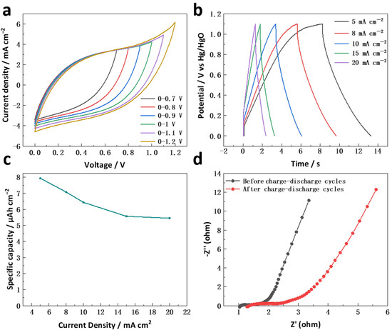 To evaluate the performance of the hollow CoSn(OH)6 nanocubes electrode in practical applications, the symmetric capacitor was assembled, and the electrochemical performance of the electrode in a two-electrode system was further studied [11]. In order to determine the appropriate operating voltage window range of the symmetrical capacitor, CV tests are carried out at different voltages starting from 0 V at a scanning speed of 100 mV s−1. As can be seen from Figure 6a, the assembled symmetrical capacitor exhibits obvious polarization in the 1.2 V voltage window. Therefore, 0–1.1 V is determined to be the appropriate operating voltage range. Furthermore, in Figure 6b, as the charge and discharge current densities increase from 5 to 20 mA cm−2, the GCD curve of the hollow CoSn(OH)6 nanocubes electrode still maintains a suitable line type, indicating that the electrode has an excellent rate performance. When the current density is 5 mA cm−2, the specific capacity of the symmetrical capacitor is 7.94 μAh cm−2. When the current density increases from 5 to 20 mA cm−2 (Figure 6c), the capacity decreases to 5.45 μAh cm−2, which shows that the capacitor has good rate performance. To further study the electrochemical performance of the symmetric capacitor, EIS was carried out. Figure 6d shows the Nyquist diagram of a capacitor composed of hollow CoSn(OH)6 nanocubes electrodes before and after 10,000 charge–discharge cycles. The curve in the figure is composed of a semicircle in the high-frequency region and a straight line in the low-frequency region from which Rs representing the ohmic internal resistance and Rct representing the charge transfer resistance can be obtained. Through fitting, the Rs and Rct values of the two curves before and after the cycle are obtained, in which the Rs difference is 0.29 Ω and Rct difference is 2.2 Ω. These values indicate the electrochemical stability of the material, i.e., the CoSn(OH)6//AC asymmetric capacitor has cycle durability [10]. All of these results suggest that the electrode conductivity is high, and this accounts for the good electrochemical performance of the symmetric capacitor.