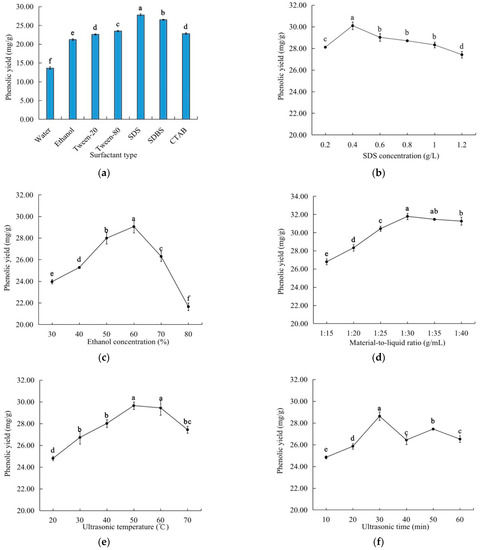 Effects of the different variables on the extraction yield of the total phenolics: (a) surfactant type; (b) SDS concentration; (c) ethanol concentration; (d) material-to-liquid ratio; (e) ultrasonic temperature; (f) ultrasonic time; (g) ultrasonic power. Different letters indicate significant differences (p < 0.05).