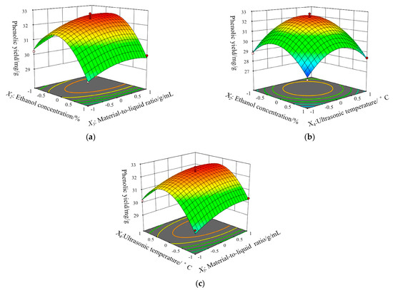 Response surface plots showing the effect of two of the three independent variables on the extraction yield (mg/g) of the total phenolics, the two changed variables were: (a) ethanol concentration and the material-to-liquid ratio; (b) the ethanol concentration and ultrasonic temperature; (c) the material-to-liquid ratio and ultrasonic temperature.