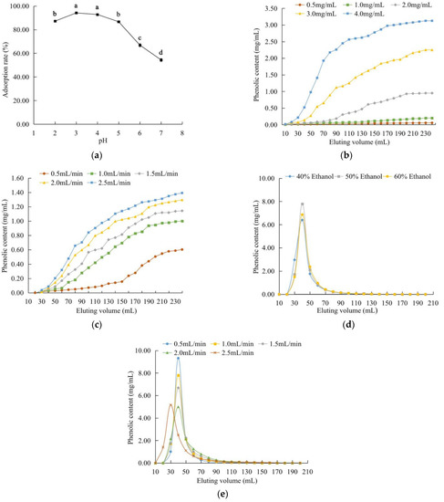Effects of the different variables on the adsorption and desorption properties of LSA-900C: (a) the pH of the crude extract solution; (b) the mass concentration of the crude extract solution; (c) the flow rates of the crude extract solution; (d) the concentration of ethanol in the eluent; (e) the flow rate for the elution. Different letters indicate significant differences (p < 0.05).