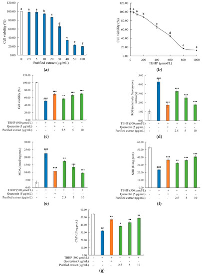 To examine the potential cytotoxicity of the purified C. speciosa antioxidant-enriched extract, TBHP and quercetin (as a reference), the CCK-8 assay was performed to determine cell viability. As shown in Figure 5a, the relative viability of the cells treated with the purified extract at 10 µg/mL or lower, was higher than 90%, indicating that the purified extract at a concentration not higher than 10 µg/mL, did not have obvious toxic effects on the cells. Accordingly, the concentrations of 2.5, 5 and 10 µg/mL were used for the subsequent intervention experiments.