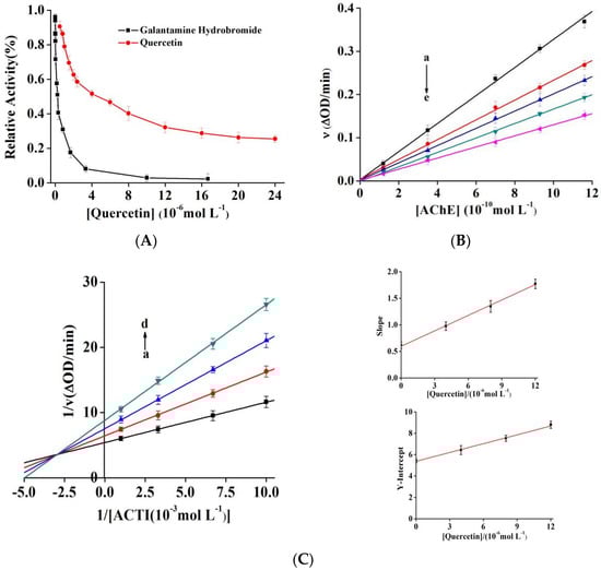 The inhibitory kinetics of quercetin on AChE were analyzed using the same method that was used to determine the enzyme activity. The concentration of the substrate ATCI (0.25 mM) was fixed, and when the concentration of quercetin was 0, 2.0, 3.2, 4.0, and 8.0 µM, the trend of the reaction rate with increasing AChE concentration was determined to evaluate the reversibility of inhibition. The AChE (0.57 nM) concentration was kept unchanged, and the quercetin reaction rate was measured at different concentrations (0, 4.0, 8.0, and 12.0 µM) with increasing ATCI concentration. The type of inhibition was determined using the Lineweaver-Burk plot in double reciprocal form.