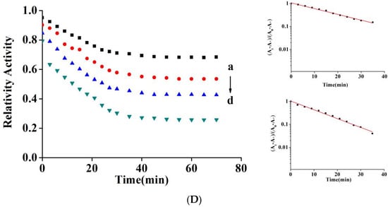 The time–course tests were used to determine the enzyme inactivation rate constants and the kinetic process with different concentrations of quercetin as 1.5, 3.0, 6.0, and 15.0 µM. We determined enzyme activities at diverse contents every 3 min for 0–30 min and every 5 min for 30–70 min.