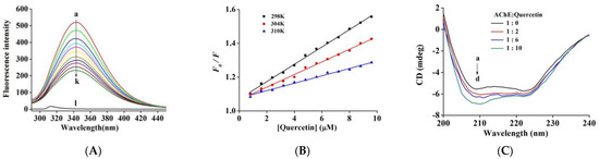 (A) Fluorescence spectra of AChE in the presence of quercetin at varying concentrations (pH 7.6, T = 25 °C). c(AChE) = 0.17 µM, c(quercetin) = 0, 0.8, 1.6, 2.4, 3.2, 4.0, 4.8, 5.6, 6.4, 7.2, and 8.0 μM (curves a → k), respectively. Curve l depicts the emission spectrum of quercetin alone. (B) The fluorescence quenching curve of quercetin on AChE at 25 °C, 31 °C, and 37 °C. (C) The CD spectra of AChE in the presence of quercetin, c(AChE) = 0.75 µM; the molar ratios of quercetin to AChE were 0:1, 2:1, 6:1 and 10:1 for curves a → d, respectively.