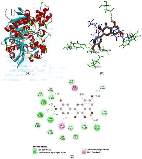 Furthermore, the PAS site possibly has a critical effect in accelerating the deposition and aggregation of β-amyloid peptides, indicating that the interaction between quercetin and PAS might reduce nerve injury caused by aggregation of Aβ-amyloid protein [47]. The result was consistent with that of Sabogal-Guaqueta, who demonstrated that quercetin significantly reduced extracellular Aβ-amyloid deposition in cerebral brain regions in a 3xTg-AD mouse model [16].