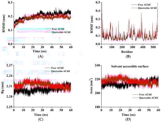 The binding of small-molecule ligands to biological macromolecules is a microscopic process that occurs in a very short time. The related parameters of MD can better evaluate the stability and conformational changes of a protein after binding with the ligand and can be used to fill the unpredictable details of experimental methods to further explore its mechanism of action [48]. Herein, MD simulation was performed to explain the structure together with the behavior of AChE and the quercetin–AChE complex.