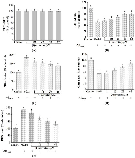 (A) The cytotoxicity of quercetin in PC12 cells. The same letter “a” indicates no significant difference (p > 0.05). (B) Effect of quercetin on the cell viability in Aβ25−35—induced PC12 cells. Effect of quercetin on the Aβ25−35—induced oxidative stress in PC12 cells: MDA content (C) and GSH level (D). (E) Effect of quercetin on Aβ25–35—induced ROS generation in PC12 cells. All data are presented as the mean ± SEM of six independent experiments. In Figure 7A–E, the different superscript letters “a–f” mean significant statistical difference (p < 0.05), and the same letters indicate no significant difference (p > 0.05).