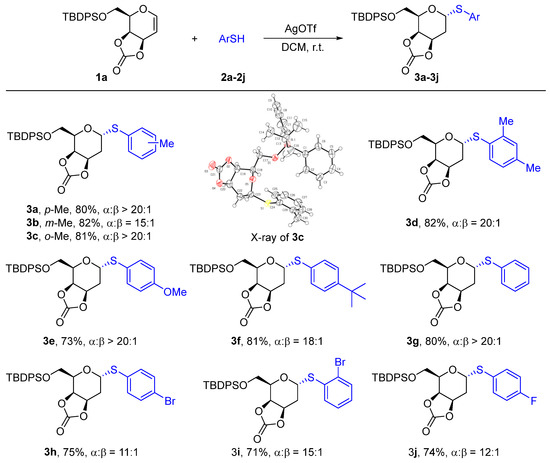 With the optimized condition in hand, the substrate scope was first explored using thiophenols (Scheme 2). The aryl 2-deoxythioglycosides (3a-3c) were obtained using p-, m- and o-thiocresols as acceptors in yields of 80–82% and with an α/β ratio from 15:1 to > 20:1 determined by 1H NMR. Fortunately, the crystal of 3c was obtained and the configuration was confirmed as α-2-deoxy-D-galactoside by single-crystal X-ray diffraction. 3,4-Dimethylthiophenol also worked well giving 3d in an 82% yield and with a ratio of α/β = 20:1. Besides methyl substitution thiophenols, 4-methoxythiophenol reacted with 3,4-O-carbonate-D-galactal 1a to form 3e in a 73% yield with a ratio of α/β > 20:1. The bulkier substitute group on the phenyl ring also tolerated this method well. For example, 4-tert-butylthiophenol was applied to generate 3f in an 81% yield and with an α/β ratio of 18:1. Thiophenol 2-deoxysugar 3g was obtained stereoselectively (α/β > 20:1) in an 80% yield. When thiophenols were substituted by electron-withdrawing groups, the desired products (3h-3j) could still be formed in good yields but stereoselectivity decreased slightly. The 2-deoxythiosugar 3h was formed in a yield of 75% with a ratio of α:β = 11:1 using 4-bromothiophenol as the acceptor. 2-Bromothiophenol and 4-fluorothiophenol were examined and gave target products in a 71–74% yield at the ratios of α:β = 15:1 and α:β = 12:1, respectively.