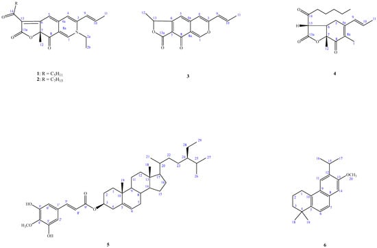 Actinomycetes have potential economic and biotechnological value and have long been recognized as major microorganisms in the medical industry. To date, there are tens of thousands of antibiotics produced by microorganisms, of which more than 70% are derived from Actinobacteria []. Secondary metabolites of Actinobacteria have various structures and biological activities, including antibacterial, antifungal, antitumor, insecticidal and herbicidal, enzyme inhibition, immune regulation, etc. [,], which indicates that Actinobacteria have great potential for the development of new medicines. As part of our investigations aimed at exploring structurally novel bioactive secondary metabolites from actinomycetes, our chemical research on the fermentation extract of Acrocarpospora punica led to the isolation of five previously undescribed compounds, namely, acrocarpunicain A–F (1–6) (Figure 2). The structure of these isolates was determined by spectroscopic experiments. The BuOH soluble fraction from the A. punica fermentation broth was tested in vitro and demonstrated anti-inflammatory activity that decreased LPS-stimulated nitric oxide (NO) in RAW 264.7 cells. In addition, compounds 1, 2, 3, and 6 showed potent inhibition with IC50 values ≤27.17 μM, against lipopolysaccharide (LPS)-induced nitric oxide (NO) generation, stronger than the positive control, quercetin (IC50 = 35.95 ± 2.34 μM). To the best of our knowledge, this is the first report on azaphilones (1–3) and phenanthrene analogs (6) from the genus Acrocarpospora.