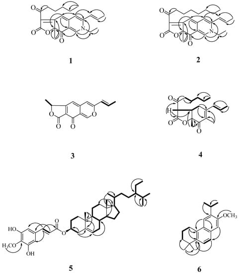 Key COSY (▬) and HMBC (→) correlations of 1, 2, and 4–6.
