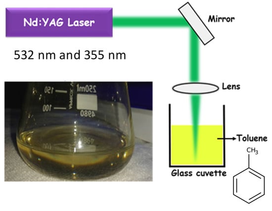 An Nd:YAG Laser beam (Litron LPY 674G-10, repetition rate-10 Hz, pulse width-8 ns) was focused into a glass cuvette containing 30 mL of toluene and ablated that carbon source for 120 s, corresponding to different laser energy densities (starting from 1 Jcm−2 to 3 Jcm−2), which immediately results in the generation of graphene quantum dots (see Figure 1). The experiments have been performed at second (532 nm) and third (355 nm) harmonic laser wavelengths. Here, the bottom-up synthesis approach for generating highly pure colloidal GQDs has been employed. Laser irradiation creates high non-equilibrium conditions within liquids with extremely high pressure and temperature where anomalous processes and the fast growth of the fragmented nano-sized species can occur. A change in color of the solution to transparent yellow after the irradiation has been observed (Figure 1), which infers the formation of GQDs. Further, the samples were centrifuged at 6000 rpm for 20 min and then the GQDs will remain in the supernatant liquid.