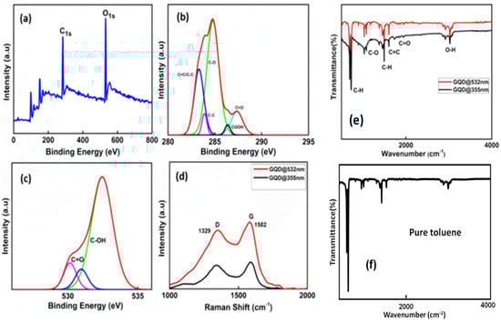The Raman spectra of GQDs are shown in Figure 3d, where peaks around 1329 cm−1 and 1582 cm−1 represent the D-band and G-band, respectively. The D and G peaks appeared in the spectrum attributed to the aromatic domains of graphene quantum dots. The peak at 1329 cm−1 is associated to the disordered band due to structural defects, dangling and edge sp3 carbon bonds that break the symmetry and the peak at 1582 cm−1 correspond to the in plane stretching vibration of sp2 carbon atoms. The intensity of the G band is related to the amount of sp2 domains whereas the D band to the sp3 domains. The intensity ratio between the D and G bands (ID/IG) can be employed to examine the sp3 structure of the GQDs. There is no appreciable difference in the ID/IG ratio (0.94) for both GQD@532 nm and GQD@355 nm. This implies that the synthesized GQDs have more disordered structure and this could be due to the presence of more oxygen-containing functional groups in the prepared GQDs. Consequently, the intensity of Raman scattering was determined by the concentration of particles confirming that the scattered Raman intensity has increased in the case of GQD@532 nm. The functional groups of GQDs were identified by FTIR spectroscopy by analyzing their vibrational spectra. Existence of C=O, O–H and C–O groups in GQDs are substantiated by FTIR spectroscopy. Figure 3e shows the FTIR spectra of GQDs synthesized at two different laser wavelengths. The FTIR spectra of GQDs (in solution form) show highly resolved peaks corresponding to stretching frequency of O–H, C=O and C–O groups. The bands at 2981 cm−1 and 1375 cm−1 are attributed to the stretching and bending vibrations of C–H groups, respectively. The broad band at 3423 cm−1 is assigned to the stretching frequency of O–H groups. The bands at 2981 cm−1 and 1375 cm−1, respectively, are attributed to the stretching and bending vibrations of C–H groups. The bands around 1728 cm−1 and 1225 cm−1 are due to the stretching of C=O and C–O groups, respectively. The peak at 1625 cm−1 indicates the existence of aromatic C=C groups. It can be seen that the C-H bending and stretching occurs at 1468 cm−1 and 2930 cm−1 respectively and the C=C bonds shows the presence of aromatic carbon which is situated at around 1735 cm−1 [55]. Of note, after being laser irradiated, the FTIR spectra of the GQDs suspension showed the same characteristics as pure toluene (compare spectra in Figure 1e,f), confirming that the solvent after laser irradiation was still toluene.
