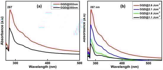 To obtain the optical properties, UV-Vis analysis of GQDs were carried out. Figure 4a) shows the UV Visible absorption spectra of GQD@532 nm and GQD@355 nm synthesized at 2.6 Jcm−2 laser fluence. The absorption spectra of both the prepared samples are almost identical and at 287 nm with a small shoulder peak at around 340 nm that corresponds to the n-π* transitions of the carbon oxygen bond (C=O), which is most obviously seen in graphene [56]. Here, it can also be seen that the absorption intensity increases with increase in the laser wavelength and fluence which indicates the increase in particle size and concentration at higher wavelength ablated species (Figure 4b). Since the absorption cross section is proportional to square diameter of absorbing particles, much smaller absorbance occurred in the case of 355 nm indicating smaller density of absorbing particles. Irradiation with a 355 nm wavelength resulted in a surprisingly small production rate compared to longer wavelengths, such as 532 nm, due to absorption of the laser radiation on a short path.