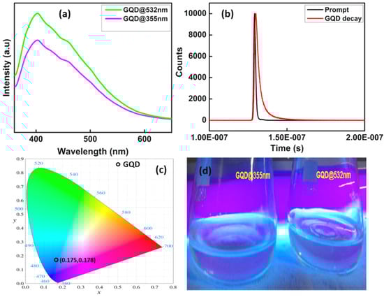 The photoluminescence properties of the samples are shown in the Figure 5a. The PL emission of GQDs synthesized at 2.6 Jcm−2 at second and third harmonics of laser wavelengths and the PL emission is observed at 406 nm at an excitation wavelength 360 nm. From this it could be inferred that the GQDs exhibits blue fluorescence, which is the contribution of emission from LUMO to HUMO [35]. It has also been observed that there is a small luminescence quenching takes place with a little reduction in intensity in the case of GQD@355 nm. Moreover, the PL intensity enhances with the increase in laser wavelength and the strong photoluminescence activity of the prepared GQDs in the ultraviolet-visible region can be explored in various sensing applications.
