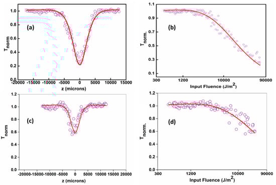 (a,b) Open aperture z-scan of GQDs@532 nm, 5 ns laser pulse excitation at laser pulse energy of 25 µJ. (c,d) Open aperture z-scan of GQDs@355 nm, 5 ns laser pulse excitation at laser pulse energy of 25 µJ. Open circles: data points, solid lines: numerical fits to the data points.