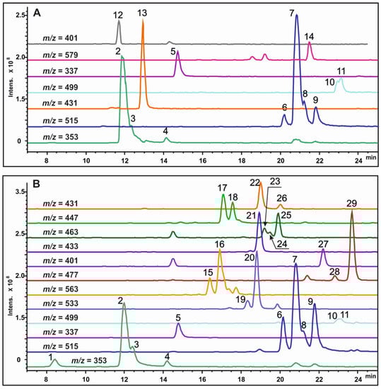 The HPLC-ESI-MS analysis of extracts obtained from the Sr-L1 callus line (A) and leaves (B) of S. radiata. Extracted ion chromatograms of the identified components in negative ion detection mode are presented. The monitored ions correspond to the most abundant deprotonated molecules [M-H]− for 1–11 and 14–29, and acetylated molecular ions [M+CH3COO]− for 12 and 13. Peak numbers correspond to each of the identified components listed in Table 1, Table 2, Table 3 and Table 4.