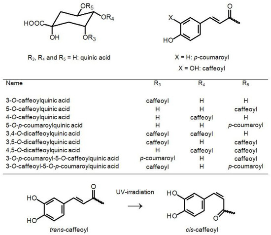 Structures of caffeoylquinic acids found in S. radiate plants and calluses. A scheme explaining geometric isomerization of caffeoyl moieties under UV irradiation is presented.