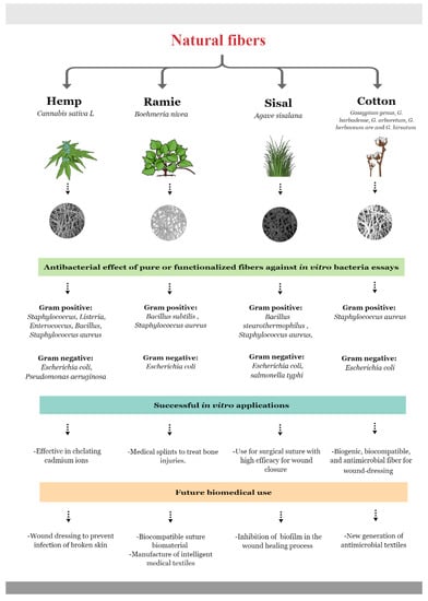 Recently, sisal, ramie, and hemp fibers have been studied in biomedical applications due to their morphological bioactive molecules such as cannabidiol, high concentration of phenolic and flavonoid compounds, and antibacterial properties. Current research uses vegetable fibers and other structural compounds to form biocomposites, showing ideal mechanical, biodegradability, and antibacterial properties for their potential use in orthopedics, implants, medical textiles, and tissue engineering. The opportunity to use natural resources to reduce infection rates in surgeries, implants, materials, and medical supplies and their application opens an opportunity for short-term needs such as for cutaneous applications. Despite the publications on the antibacterial properties of natural fibers in biomedical applications, few works have reached in vivo experimentation, which is a necessary step for future applications and an adequate evaluation of the safety of natural fibers.