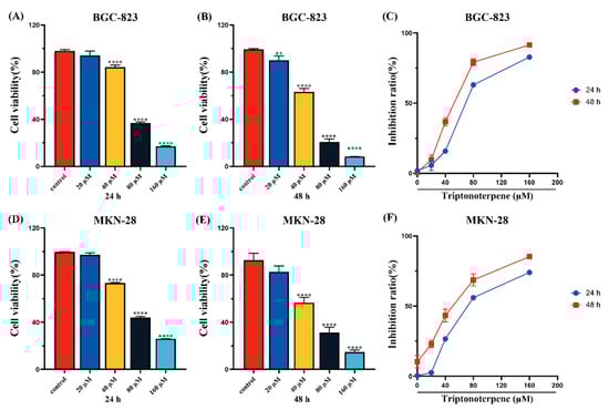 Cell viability was detected using the CCK-8 assay. (A,B) The survival rates of the BGC-823 cells after 24 h and 48 h interventions with different concentrations of Triptonoterpene. (C) The inhibitory rates of Triptonoterpene on the BGC-823 cells after 24 h and 48 h. (D,E) The survival rates of the MKN-28 cells after 24 h and 48 h interventions with different concentrations of Triptonoterpene. (F) The inhibitory rates of Triptonoterpene on the MKN-28 cells after 24 h and 48 h. ** p < 0.01 and **** p < 0.0001.