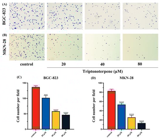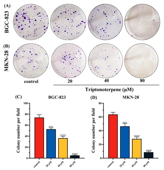 Cell proliferation was examined by the cell colony formation experiment. (A,C) Number of clones of the BGC-823 cells treated with Triptonoterpene for 24 h. (B,D) Number of clones of the MKN-28 cells treated with Triptonoterpene for 24 h. *** p < 0.001 and **** p < 0.0001.