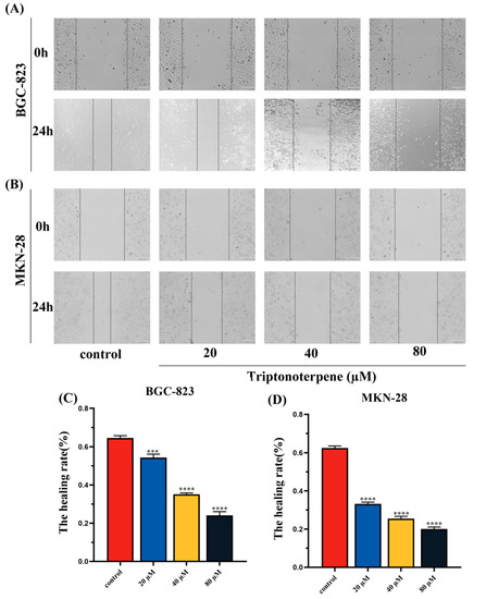 The BGC-823 and MKN-28 cells were seeded at 3 × 105 cells per well in a 24-well plate. When the cells’ fusion degree exceeded 80%, linear scratch wounds were created on the confluent cell monolayers using a 200 μL pipette tip. Triptonoterpene was added to the cells and the cells were incubated at 37 °C in a 5% CO2 incubator. After Triptonoterpene was added to the GC cells, the scratch area of the cells was observed and photographed under a microscope at 0 h and 24 h, respectively.