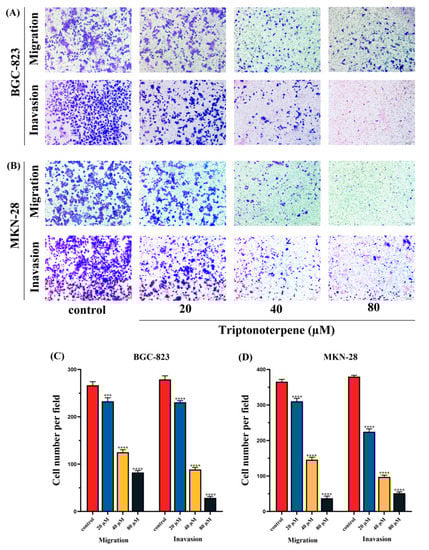 First, 50 μL Matrigel gel was added to the Transwell chambers, which solidified at 4 °C. The BGC-823 and MKN-28 cells were resuspended in serum-free medium and added to the upper chamber at 2 × 104 cells per well. Triptonoterpene was added into the lower chamber and the cells were continuously cultured for 24 h. The medium was discarded, 4% paraformaldehyde was used to immobilize cells for 15 min, and then crystal violet was used to dye cells for 15 min. After the chamber was cleaned with PBS, the number of cells penetrating the membrane was observed under an inverted microscope. The cell migration assay did not require the addition of Matrigel to the 24-well plate. The other steps of the cell migration assay are the same as those of the cell invasion assay.