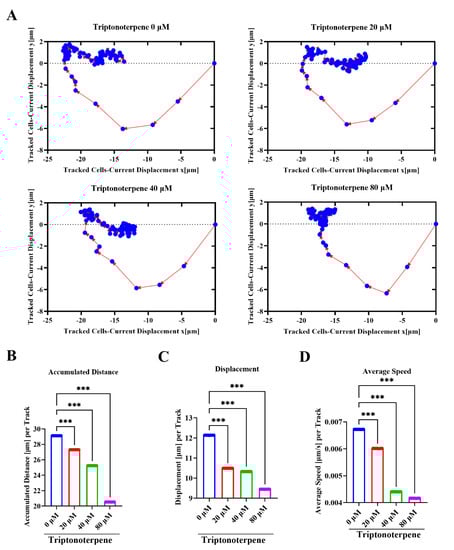 The movement tracks and speed of the GC cells were examined using high−intensity imaging technology. (A) Locus of GC cells 12 h after the Triptonoterpene treatment. (B) Total movement distance of the GC cells in 12 h. (C) Average displacement of the GC cells in different drug groups. (D) Average movement speed of the GC cells in different drug groups within 12 h. *** p < 0.001.