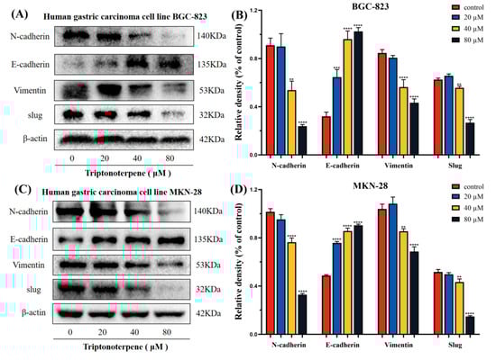 To further explore the mechanism whereby Triptonoterpene inhibits the GC cells’ invasion and metastasis, we measured the expression levels of the EMT-related proteins. The expression levels of these proteins directly reflect the invasion ability of the GC cells. The experimental results show that Triptonoterpene upregulates the expression level of E-cadherin in the GC cells, while the expression levels of N-cadherin, Vimentin, and Slug are down-regulated (Figure 7). The Western blot results suggest that Triptonoterpene may be able to inhibit GC cell invasion and metastasis by inhibiting the EMT process.