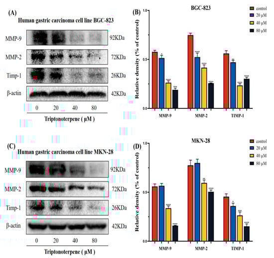 We also examined the effects of Triptonoterpene on the expression of the key proteins of MMPs. The experimental results show that the expression of MMP-9, MMP-2, and Timp-1 of the Triptonoterpene group were reduced in the BGC-823 and MKN-28 cells (Figure 8). This shows that Triptonoterpene can inhibit the expression of key proteins of MMPs to prevent the degradation of ECM.
