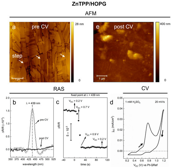 (a) (5 × 5) µm2 topographic image of a 6 nm thick ZnTPP/HOPG sample; white arrows points at some steps of the HOPG substrate. The AFM image was acquired ex situ on an as-deposited sample. (b) RAS spectra in the 350–525 nm range, acquired when the sample is in the EC cell filled with a 1 mM H2SO4 solution. Spectra acquired before (line + symbol) and after (solid line) the CV are reported. (c) Real-time RAS monitoring of the Soret-related band intensity (λ = 439 nm) during CV in a 1 mM H2SO4 solution. The time axis is rescaled to show all the time range covered by the sweep of the EC potentials in the CV; time = 0 s corresponds to the starting point of the CV (VEC = 0.2 V); spectral points are collected every 5 s. The scale of the y-axis is showed by a vertical bar. Arrows and labels indicate the EC potentials reached during the CV. (d) Voltammogram obtained during the CV in a 1 mM H2SO4 solution; the potential is swept within the 0.2–1.2 V range, from anodic to cathodic regime (see the black arrows); sweep rate = 20 mV/s; step = 1 mV. (e) (5 × 5) µm2 topographic image of the ZnTPP/HOPG sample, acquired ex situ after the EC treatment in a 1 mM H2SO4 solution.