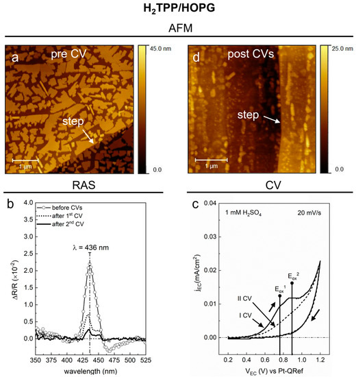 The final morphology of the sample, revealed by ex situ AFM, is shown in Figure 3d. As for the ZnTPP 3D phase, the H2TPP 3D phase after the EC treatment looks quite changed compared to the pristine condition (panel a) and in agreement with previous observations of the morphology of H2TPP films treated in different kind of acid solutions [18,19]. Differently from the ZnTPP case in Figure 2, here, some form of crystallinity appears to have been preserved and some regular shapes, resembling nanocrystals, are still recognizable; in addition, the prevailing orientation of these 3D structures is still aligned along the HOPG steps. This kind of morphology supports the interpretation of the spectra measured by RAS (Figure 3b), where the residual final anisotropy looks like the convolution of a signal coming from the 2D phase and another one from an electrochemically modified 3D phase.