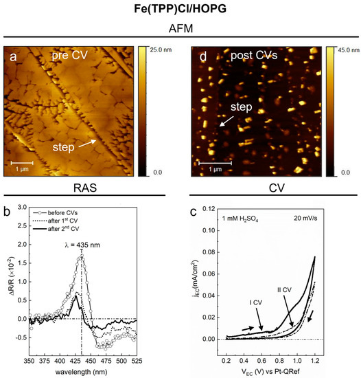 (a) (5 × 5) µm2 topographic image of the 6 nm thick Fe(TPP)Cl/HOPG sample; the white arrow points at one of the HOPG substrate steps. The AFM image was acquired ex situ on the as-deposited sample. (b) RAS spectra in the 350–525 nm range, acquired with the sample in the EC cell filled by a 1 mM H2SO4 solution. A comparison between three spectra is reported: one acquired before the CV (line + symbol), a second one after the first CV (dotted line), and a third one after the second CV (solid line). (c) Voltammograms obtained during the two consecutive CV (labeled as I and II) in a 1 mM H2SO4 solution; range: (0.2–1.2) V, from anodic to cathodic regime; sweep rate = 20 mV/s; step = 1 mV. (d) (3.5 × 3.5) µm2 topographic image of the Fe(TPP)Cl/HOPG sample acquired ex situ after two EC treatments in a 1 mM H2SO4 solution; the white arrow points at one of the steps of the HOPG substrate.