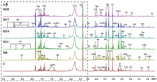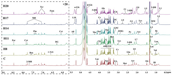 600 MHz 1H NMR spectra (δ0.5–9.0) of serum’s samples obtained from C group, and H group at different periods (D8, D11, D14, D17, and D20). The spectra in the region δ5.5–9.5 were magnified 20 times compared with the region δ0.5–5.5 for the purpose of clarity. Ala, alanine; 3-HB, 3-Hydroxybutyrate; 3-MH, 3-Methylhistidine; AA, acetoacetate; Ace, acetate; Act, acetone; All, allantoin; Ben, benzoate; Bet, betaine; c-Acn, cis-aconitate; Ch, choline; Ci, citrate; Cr, creatine; Cyt, cytidine; DG, deoxyguanosine; DMG, N,N-Dimethylglycine; EA, ethanolamine; For, formate; Fum, fumarate; G, glycerol; Gln, glutamine; Gly, glycine; GPC, glycerophosphocholine; IB, isobutyrate; Ile, isoleucine; Leu, leucine; L1, L3, LDL; L2, L4, L5, VLDL; L6, L7, L8, L9, L10, lipid; Lac, lactate; Lys, lysine; Met, methionine; MH, 1-Methylhistidine; MM, methylmalonate; NAG, N-Actyl-glycoprotein; PC, phosphocholine; Phe, phenylalanine; Py, pyruvate; Sar, sarcosine; Ser, serine; Thr, threonine; Tyr, tyrosine; Val, valine; α-Glc, α-Glucose; β-Glc, β-Glucose.