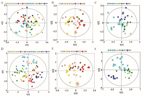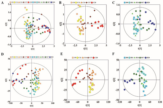 PCA and corresponding PLS-DA score plots derived from 1H NMR spectra of plasma samples obtained from different groups at different gestation period. (A) PCA score plots of control group and hypoxia group; (B) PCA score plots of control group; (C) PCA score plots of hypoxia group. (D–F) corresponding PLS-DA score plots of (A–C). (C: control group; H: hypoxia groups).