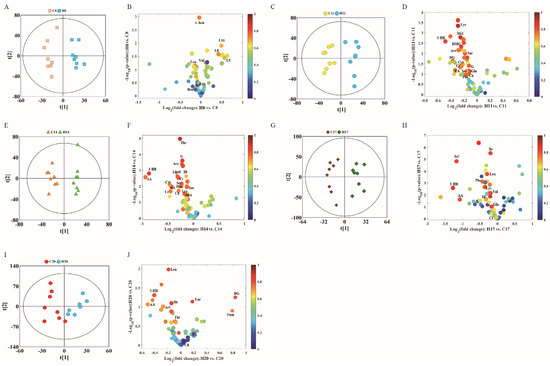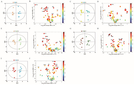 OPLS-DA score plots (left panel) derived from 1H NMR spectra of plasma samples and corresponding volcano plots (right panels) obtained from different groups and cross validation (lower panel) by permutation test (n = 200). (A,B) D8; (C,D) D11; (E,F) D14; (G,H) D17; and (I,J) D20. The color map shows the significance of metabolites variations between the two classes. Peaks in the positive direction indicate metabolites that are more abundant in the groups in the positive direction of first principal component. Consequently, metabolites that are more abundant in the groups in the negative direction of first primary component are presented as peaks in the negative direction. Keys of the assignments were shown in Figure 1.