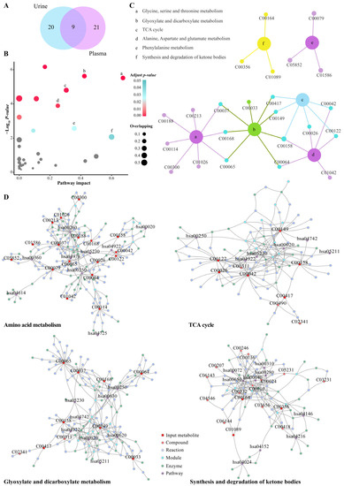 Pathway analysis and network diffusion analysis of differential metabolites. (A) Venn diagram of selected differential metabolites in urine and plasma. (B) Pathway analysis results of the MetaboAnalyst tools. The grey points indicate no significantly enriched pathway (adjusted p values > 0.05); the points of light blue to red indicate significantly enriched pathways (adjusted p values < 0.05); the size of the points indicates the number of overlapping metabolites in the pathway. (C) Plot showing the relevant differential metabolites contained in significantly enriched pathways. (D) Significantly enriched pathway-related metabolite–enzyme–reaction–module–pathway networks.