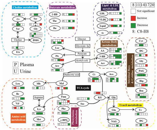Through OPLS-DA and the correlation coefficient for each metabolite, we further summarized the metabolites which showed significant between-group differences. Compared with the control group, the hypoxia group showed significantly different levels of 29 urinary metabolites at different gestational time-points. The metabolite changes induced by hypoxia are summarized below: (1) The levels of citric acid and succinic acid (intermediates of TCA cycle) significantly decreased on D20, fumaric acid decreased on D8, while alpha-ketoglutarate significantly increased on D8 and D11. Malic acid significantly increased on D8 and D17, and decreased on D20. (2) Acetoacetic acid, 3-hydroxybutyric acid, and acetone levels showed a downward trend, which were similar to that in plasma, especially on D14 and D17, when these three ketones showed a significant decrease. (3) Glycine was significantly increased on D20. Phenylacetylglycine showed a significant decrease at all time-points, except on D20. Hippuric acid significantly increased on D14 and D17, while it significantly decreased on D20. Benzoic acid also significantly decreased in urine samples of D11, D14, and D17. (4) Lactic acid levels decreased on D8, D14, and D17. Pyridine formic acid decreased on D14, while it significantly increased on D17 and D20. (5) Uric acid significantly decreased on D8 and N-acetylglutamic acid significantly decreased on D17.