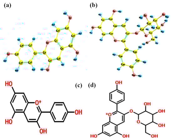 Optimized conformers of (a) pelargonidin, (b) pelargonidin-3-O-glucoside, (c) pelargonidin 2D conformer and (d) pelargonidin-3-O-glucoside 2D conformer.
