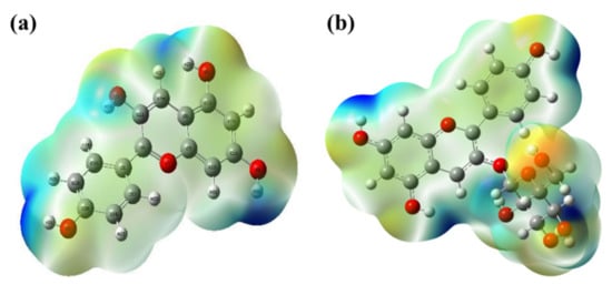 Molecular electrostatic potential (MEP) diagrams: (a) pelargonidin; and (b) pelargonidin-3-O-glucoside.