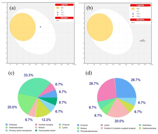 BOILED−egg graphs: (a) pelargonidin; and (b) pelargonidin−3−O−glucoside. Target prediction report: (c) pelargonidin; and (d) pelargonidin-3-O-glucoside.