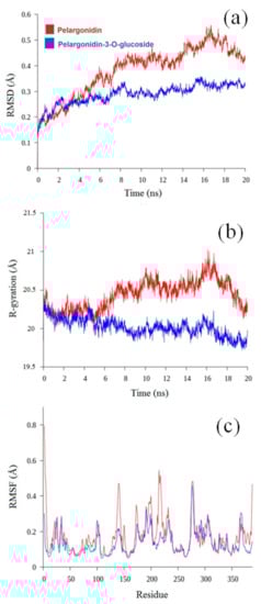 The interactions between pelargonidin and pelargonidin-3-O-glucoside have been examined using the molecular docking method. To compare the differences between these compounds at the molecular level, a 20 ns MD simulation approach was employed. Using the GROMACS program, the stability and degree of interactions between HAD and pelargonidin and pelargonidin-3-O-glucoside were further explained. The trajectory data from the 20 ns MD simulations were then analyzed in order to determine the dynamic parameters of the two compounds. In the molecular dynamics research, each system was assessed using the root mean square deviation (RMSD), radius of gyration (Rg), solvent accessible surface area (SASA), and root mean square fluctuation (RMSF). The obtained results are displayed in Figure 6a–c.