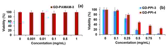 No cytotoxic effect was observed with GD-PAMAM-3 (from 0.001 µg/mL to 1 mg/mL) (Figure 1a), whereas the cell toxicity of dendrimers GD-PPI generations 3 and 4 was observed for concentrations equal or above 0.25 mg/mL. The viability percentage decreased with the increase of GD-PPI concentration (Figure 1b). The results show that GD-PPI-4 is less toxic than GD-PPI-3. This is probably due to the number of hydroxyl moieties present at the periphery (32 and 64 hydroxyl functions for GD-PPI-3 and GD-PPI-4, respectively). A higher number of hydroxyl groups favors electrostatic repulsion which limits the toxicity. Our results are in accordance with cytotoxicity data obtained previously with the same dendrimers on Human MRC5 fibroblasts from the lungs [25,26].