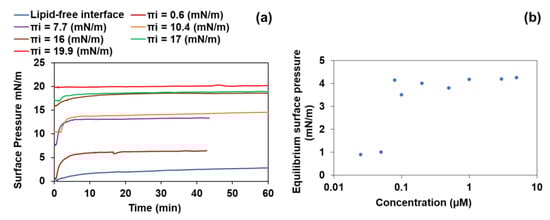 (a) Kinetics of GD-PAMAM-3 (0.2 µM in the subphase at pH 7.4) adsorption to a bare interface or to a SC mimicking lipid monolayer (C24Cer2/Chol/C24FA 1:1:1 molar ratio). The time zero indicates the time of GD-PAMAM injection underneath the bare interface or the lipid monolayer at different initial surface pressures (Πi); (b) Evolution of the equilibrium surface pressure further to the adsorption of GD-PAMAM-3 at a bare interface as a function of GD-PAMAM-3 concentration in the subphase at pH 7.4.