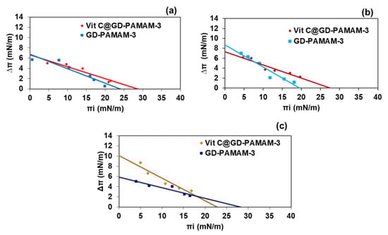 A decrease of ΔΠ over Πi increase is observed. The intersection of the linear regression with the x-axis allows for determining the maximum insertion pressure (MIP), which is related to the insertion power of the dendrimers in the lipid monolayer. Its intersection with the y-axis allows for determining the maximum surface pressure variation (ΔΠ0). By subtracting to ΔΠ0, the equilibrium surface pressure reached by the same concentration of GD-PAMAM-3 at a bare interface, the differential dΠ0 can be determined. It reflects the attractive effect of the lipids for dendrimers [57,59,60,61].