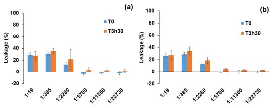 The leakage upon the addition of GD-PAMAM-3 at T0 decreases with the decrease of GD-PAMAM-3:liposome molar ratio (Figure 4a). No permeabilizing effect at low molar ratios and limited permeabilizing effect (lower or equal 35%) at higher ratios was observed, which is in agreement with the low cytotoxicity observed on dermal cells. The permeabilizing effect appears upon the contact at T0 between the dendrimers and the liposomes and does not change over time (T 3h30). The small permeabilizing effect of GD-PAMAM-3 on the liposomes can be explained by the liposome aggregation phenomenon observed by cryo-TEM (see Figure S10 in Supplementary Materials), such as it was already detected for PAMAM-6 on other liposomes [63]. By comparing leakages induced upon GD-PAMAM-3 and VitC@GD-PAMAM-3 treatment, we noticed that there is no marked difference between the two (Figure 4a,b).