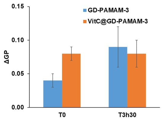 The effect of GD-PAMAM-3 in absence or presence of vitamin C on the fluidity/rigidity of SC biomimetic liposomes was determined by measuring the variation of the generalized polarization (ΔGP) of Laurdan, staining the lipid bilayer, after the addition of the dendrimers (Figure 5). Namely, when the membrane phase (ordered/fluid) changes in the vicinity of the probe, the mobility of the lipid headgroup will change and will induce an emission spectral shift of Laurdan fluorescence [64]. Thus, before and after adding the dendrimers, the change of lipid order is monitored thanks to these spectral changes, which are expressed as the variation of the ΔGP. An increase of ΔGP corresponds to a rigidification of the bilayer.