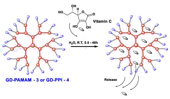 The ability of GD-PPIs and GD-PAMAMs to encapsulate vitamin C was evaluated by gravimetry after dialysis through a 1 kDa membrane, based on our previous works with organic pollutants [26]. Several encapsulation tests of vitamin C in GD-PPIs and GD-PAMAMs were performed in water at room temperature (Scheme 1). The encapsulation results are summarized in Table 1.