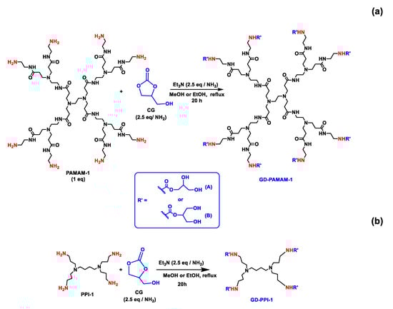 GD-PAMAMs and GD-PPIs synthesis using 2.5 equivalents of Glycerol Carbonate (CG) per NH2 function, 2.5 equivalents of triethylamine per NH2 function in refluxing Methanol for 20h. Terminal OH moieties correspond to the hydroxyl functions present in periphery.